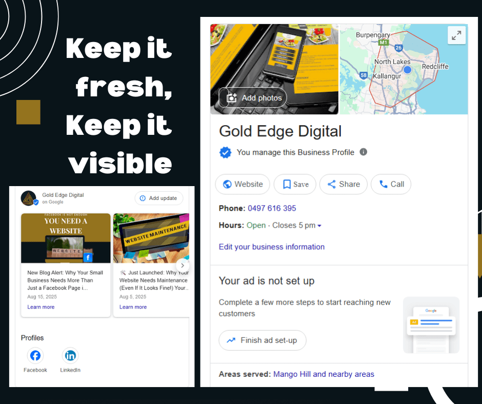 Add location-based and service-specific keywords naturally in your business description. Think “emergency plumber in North Brisbane” or “licensed electrician Mango Hill.” This helps your profile show up in the exact searches your ideal customers are making.